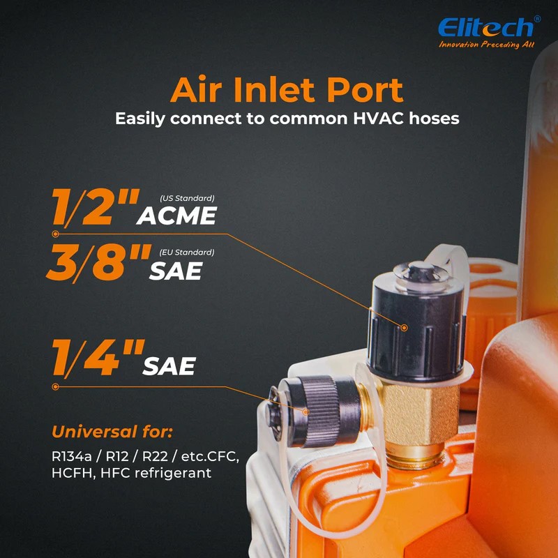 Elitech NVP-3 là máy bơm chân không kiểu rotary vane (cánh quay) một cấp (single stage), thiết kế chuyên dụng cho hệ thống HVAC / làm lạnh & điều hòa. Máy có khả năng hút mạnh (3 CFM) để tạo chân không nhanh, thân vỏ bằng hợp kim nhôm để tản nhiệt hiệu quả, cửa sổ hiển thị mực dầu cho theo dõi dễ dàng, và thiết kế thuận tiện cho bảo trì. Nó phù hợp với hệ thống 1/4" hoặc 3/8".